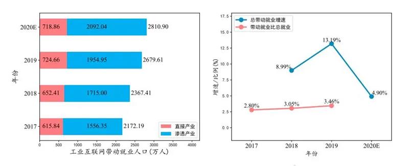 工業互聯網不斷催生新的就業崗位,緩解國內就業壓力。工業互聯網的應用推廣,加快推動我國工業企業生產制造服務體系的智能化升級、產業鏈延伸和價值鏈拓展,在深度融合各規模產業的基礎上,催生企業對于掌握信息技術 (Internet Technology, IT) 和運營技術 (OperationalTechnology, OT) 的復合型人才的需求。工業互聯網提供的就業崗位可以分為直接產業和滲透產業兩部分。據測算, 2017 2019 年工業互聯網滲透產業的就業人數約為直接產業就業人數的三倍。