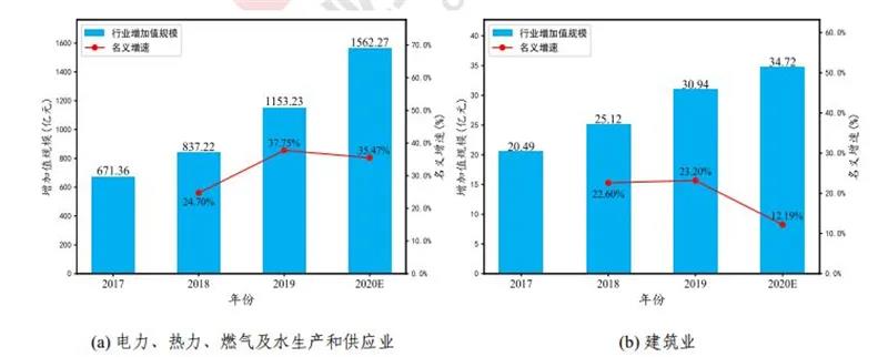 工業互聯網賦能能源行業,推動能源“四個革命”。如下圖(a) 所示,據測算, 2019 年,工業互聯網帶動電力、熱力、燃氣及水生產和供應業的增加值規模為 1153.23 億元,名義增速達到 37.75%,增速同比提升 10.46%, 在四大工業行業中增速顯著、 發展潛力巨大;帶動就業 90.63 萬人。預計2020 年,工業互聯網帶動電力、熱力、燃氣及水生產和供應業的增加值規模為 1562.27 億元,名義增速仍將保持在 35.47%, 將成為唯一一個增速超過 25% 的行業,新增就業人數 25.40 萬人,帶動就業人數將達到 116.03萬人。
