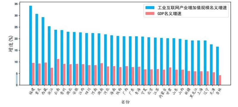 長江中游地區和長三角地區工業互聯網產業增加值規模的增速僅次于西南地區,分別為 22.71% 和 21.69%,這表明長江經濟帶的實體經濟利用工業互聯網轉型升級較為活躍;東北地區和西北地區的工業互聯網產業增加值規模的增速較慢,分別只有 18.56% 和 20.16%,東北老工業基地和西北地區的實體經濟轉型升級還有較大的空間潛力,需要進一步發揮自身優勢,建立特色產業,緊跟全國工業互聯網發展步伐。