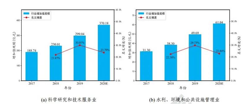 在科學研究和技術服務業,如下圖(a) 所示,據測算, 2019 年,工業互聯網帶動科學研究和技術服務業的增加值為 299.04 億元,名義增速為 30.01%;帶動就業人數 23.50 萬人。預計 2020 年,工業互聯網帶動科學研究和技術服務業的增加值規模為 370.18 億元,新增就業人數 3.99 萬人,帶動就業人數將達到 27.49 萬人。