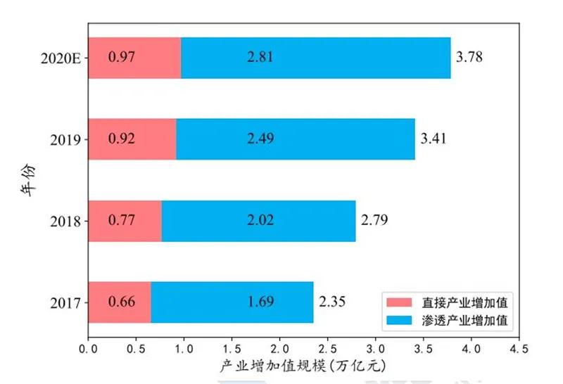 我國工業互聯網產業增加值規模持續擴大。據測算, 2019 年我國工業互聯網產業增加值規模達到 3.41 萬億元,名義增速達到 22.14%,增速同比增長 2.97 個百分點,其中工業互聯網直接產業增加值規模為 0.92 萬億元,名義增速達到 19.86%,增速同比增長 3.96 個百分點,工業互聯網滲透產業增加值規模為 2.49 萬億元,名義增速達到 23.01%,增速同比增長 2.57 個百分點。在抗擊新冠肺炎疫情過程中, 社會各界進一步加深對工業互聯網的認識,如下圖所示,預計 2020 年,工業互聯網產業增加值規模達到 3.78 萬億元,成為促進我國 GDP 增長的重要因素。
