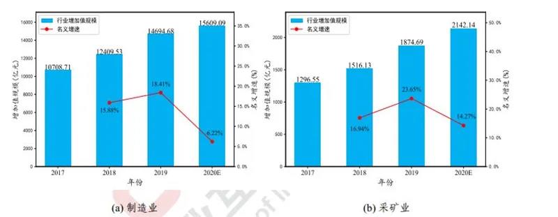 工業互聯網賦能礦產開采,保障采礦業安全生產運行。如上圖(b) 所示,據測算, 2019 年,工業互聯網帶動采礦業的增加值規模為 1874.69 億元,名義增速為 23.65%,增速同比提升 5.74%? 帶動就業 147.32 萬人。預計 2020 年,工業互聯網帶動采礦業的增加值規模為 2142.14 億元,新增就業人數 11.78 萬人,帶動就業人數將達到 159.10 萬人。我國采礦業規模大、分布范圍廣、生產危險性強,應用工業互聯網,可以推動采礦業數字化、網絡化、智能化建設,同樣也實現了采礦業安全與發展相協調的要求。