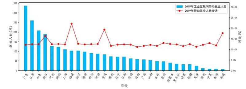 其中廣東和江蘇作為互聯網、制造業的集中分布地區,憑借其雄厚的基礎,由工業互聯網產業帶動的就業人數占工業互聯網在全國帶動就業人數的比例超過 22%,具有較大的領先優勢。2017-2019 年,工業互聯網產業分省就業人數有長尾分布的趨勢,這說明先行發展工業互聯網的部分地區已逐漸形成規模效應和集聚優勢,暫時領先的省份應發揮“領頭羊”功能,形成示范作用,帶動相對落后省份在工業互聯網領域縮小差距、迎頭趕上。
