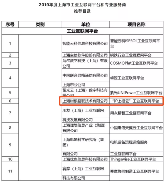 樹根科技工業互聯網平臺成功入選2019年度上海市工業互聯網平臺和專業服務商推薦目錄,成為政府認可、企業可信的工業互聯網服務平臺。