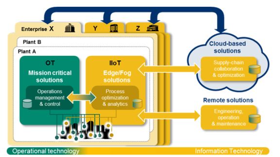 怎樣把老一輩在工廠生產(chǎn)管理的經(jīng)驗和積累的知識, 通過數(shù)字化轉(zhuǎn)型成為“數(shù)字原生” 的知識財富, 并被年青一代繼承和發(fā)展,這一挑戰(zhàn)也可理解為 OT 與 IT 交匯融合,使得 OT 和 IT 各自的“神經(jīng)突觸”緊 緊相連, 從而為創(chuàng)造更多價值提供保證。圖5 是日本橫河利用工業(yè)互聯(lián)網(wǎng) IIoT 實現(xiàn)流程工業(yè)的 OT 和 IT 融合的解決方案。