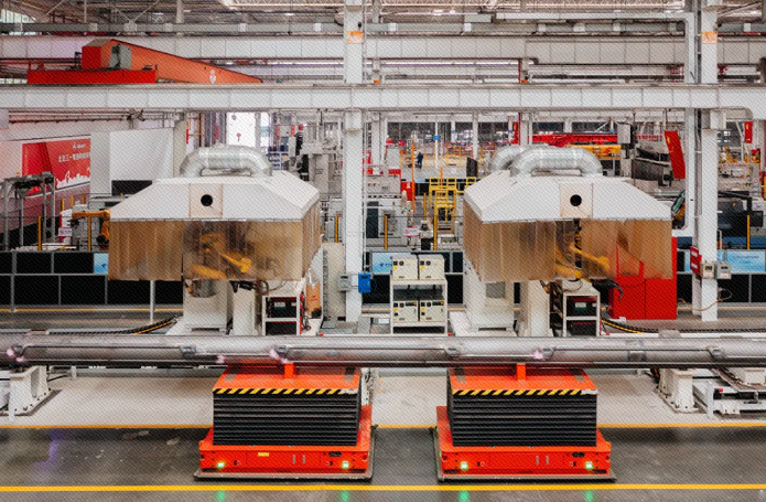 在精準授時、低時延的5G無線工業專網保證下,2臺AGV“雙車夢幻聯動”,實現27米超長超重物料的同步搬運和自動上下料。