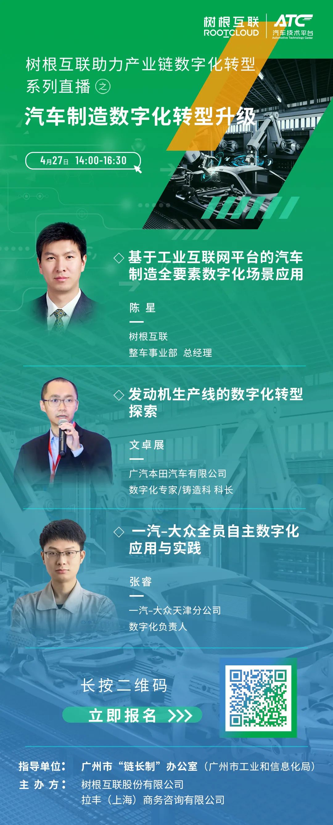 4月27日,在廣州市“鏈長制”辦公室(廣州市工業和信息化局)的指導下,樹根科技將聯合ATC 汽車技術平臺舉辦樹根科技助力產業鏈數字化轉型之“汽車制造數字化轉型升級”系列直播活動。