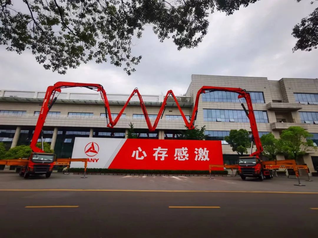 圖注:兩輛三一重工的泵車做了一個手勢;意思是“歡迎來訪”