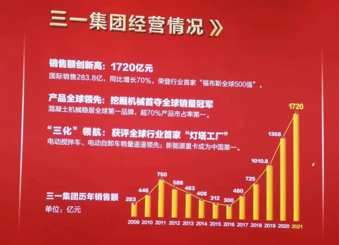 2021年,三一的銷售額達到1720億元,這個成績背后是全球5萬多個員工的功勞。2011年,三一重工的銷售額是750億元,這個成績背后站著全球8萬多個員工。也就是說:十年來,三一重工員工少了3萬個,銷售額卻增加了2倍多。