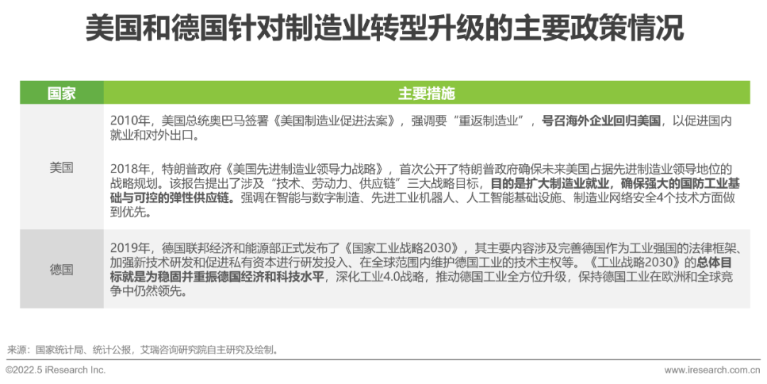 發(fā)達國家紛紛出臺政策引導制造業(yè)回流并轉(zhuǎn)型升級,如美國和德國。美國奧巴馬政府和特朗普政府都出臺相關(guān)政策表示要“重返制造業(yè)”,同時,還強調(diào)要在技術(shù)、供應鏈等方面發(fā)力,確保美國占據(jù)先進制造業(yè)的領(lǐng)導地位。德國則在2019年就提出《國家工業(yè)戰(zhàn)略2030》,并在次年將工業(yè)4.0升級為全國戰(zhàn)略,旨在保證就業(yè)的同時,要在全球范圍內(nèi)維護德國工業(yè)的技術(shù)主權(quán)、保持德國工業(yè)在歐洲和全球競爭中的領(lǐng)先地位、轉(zhuǎn)型升級為智能制造。