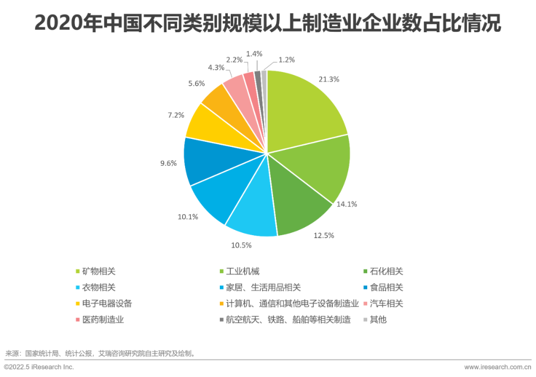 根據(jù)國家統(tǒng)計局發(fā)布的數(shù)據(jù),礦物相關(guān)、工業(yè)機械、石化相關(guān)是2020年不同類別規(guī)模以上制造業(yè)企業(yè)數(shù)的TOP3,其占比總和達48%,其中礦物相關(guān)占比最高,占比為21.3%,中國的制造業(yè)整體偏向資源導向型。