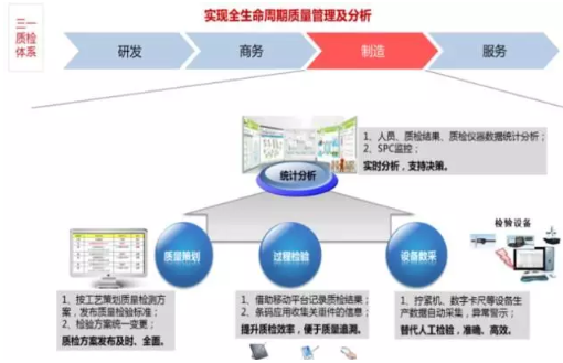 18號智能工廠通過GSP、MES、CSM及QIS的整合應用,實現(xiàn)了涵蓋供應商送貨、零件制造、整機裝配、售后服務等全生命周期的質檢數(shù)字化,以及SPC分析、質量追溯等功能。
