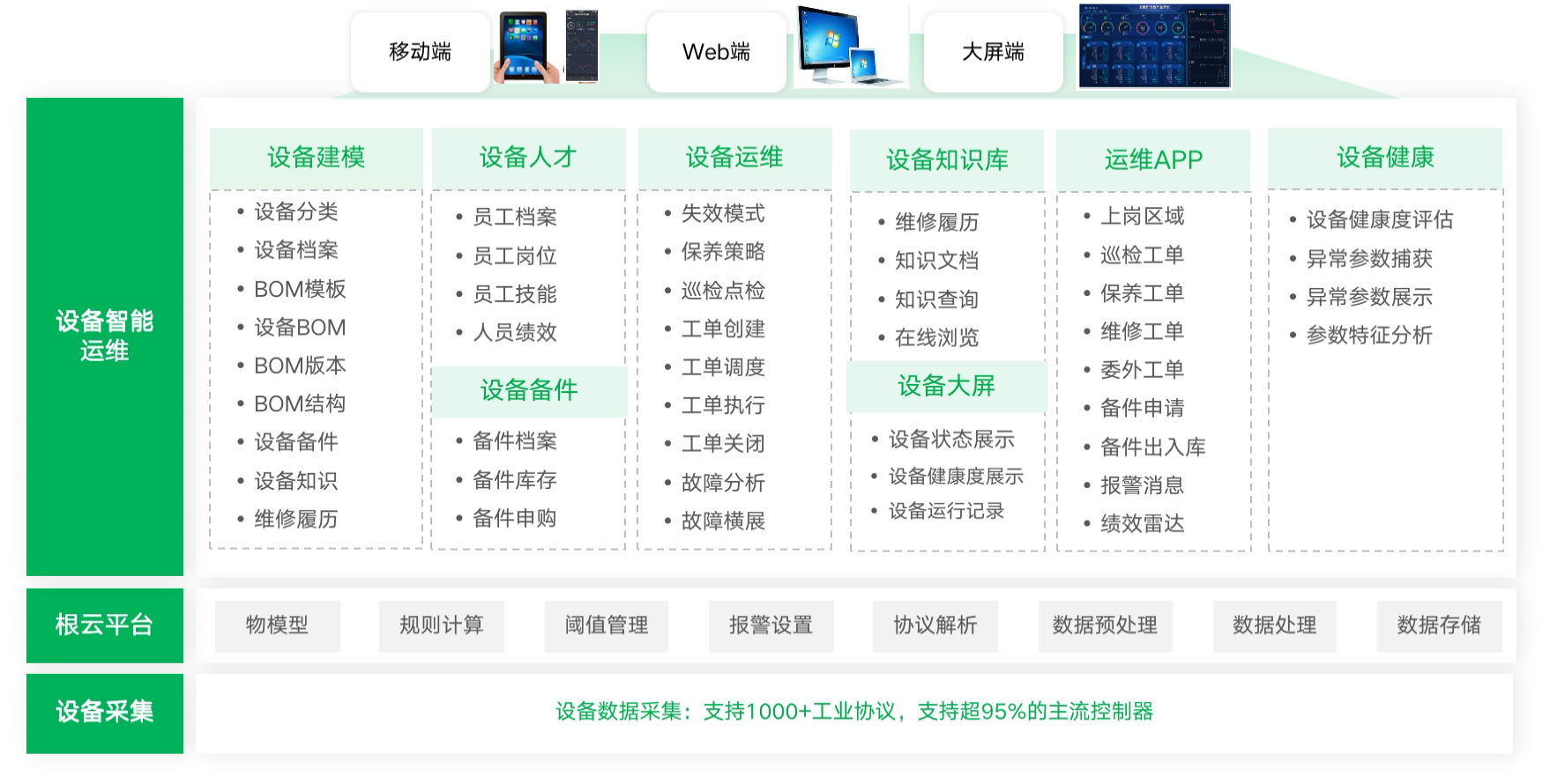 樹根設備管理解決方案內容包含數采+IoT平臺+EAM+PHM+移動APP等。滿足用戶從設備數采、設備生命周期管理、設備健康管理(預測性維護)的設備生生命周期閉環管理需求。