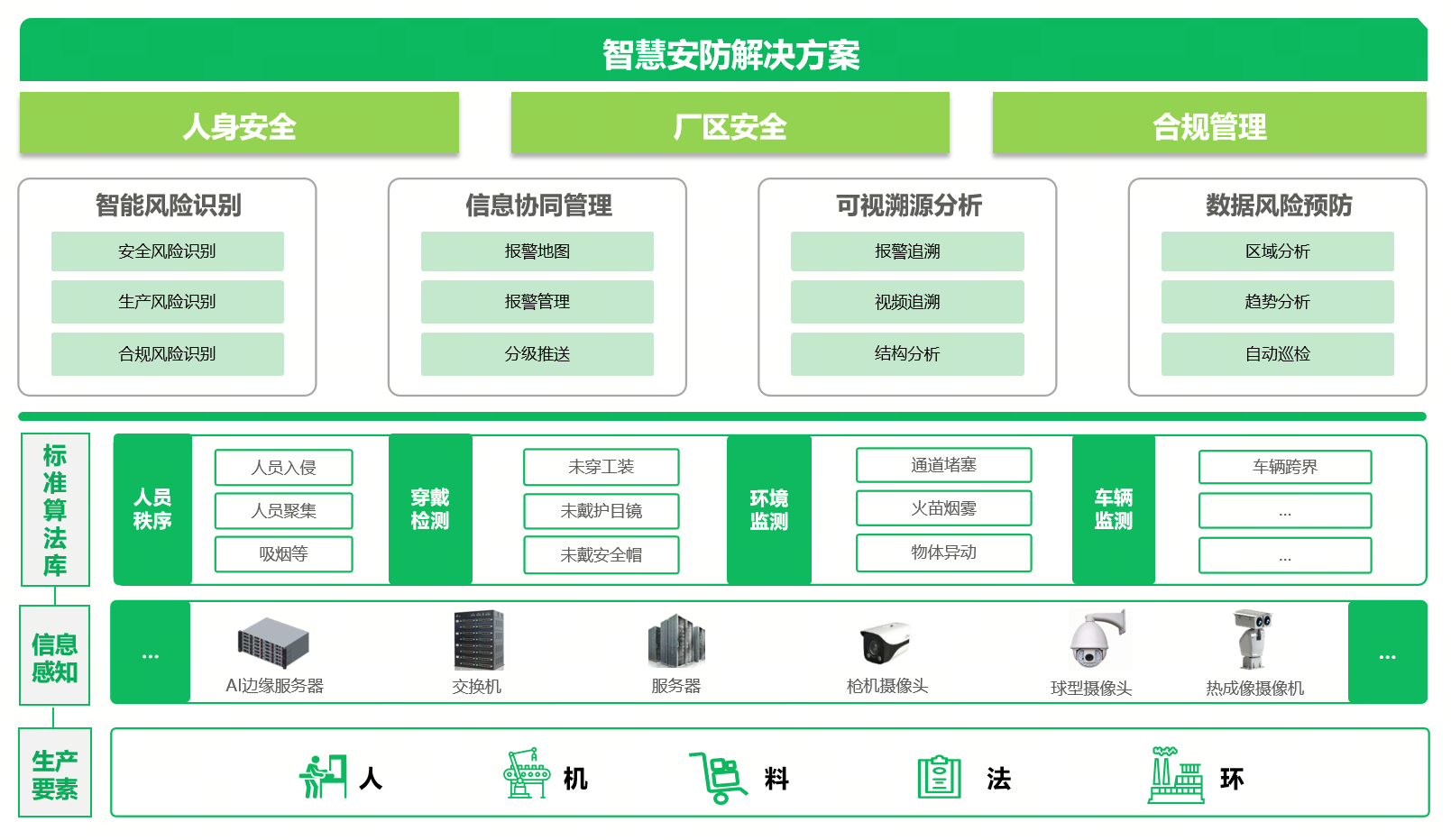 針對人身安全、廠區安全、合規管理等場景,提供視覺智能識別、風險定位、報警追溯、風險預防等功能