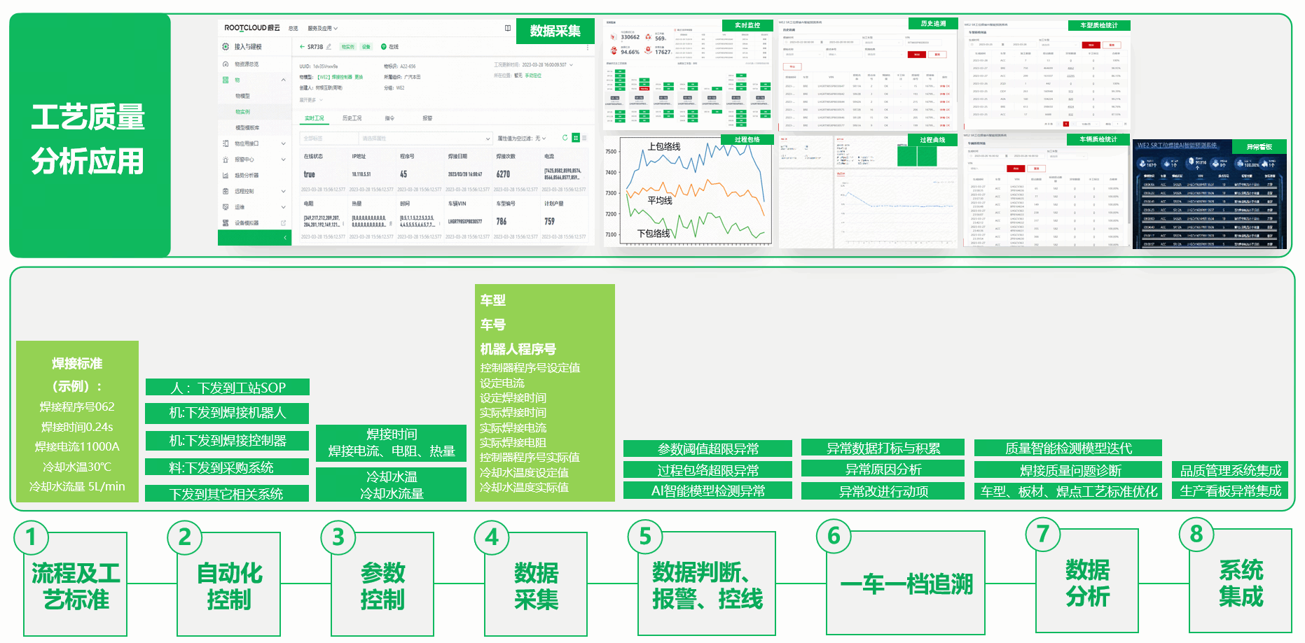 樹根專項工藝質量分析主要包括點焊工藝參數分析、點焊智能在線檢測、擰緊機程序執行監測等內容,提供從設備數采到監控、數據建模、數據分析的整體解決方案;